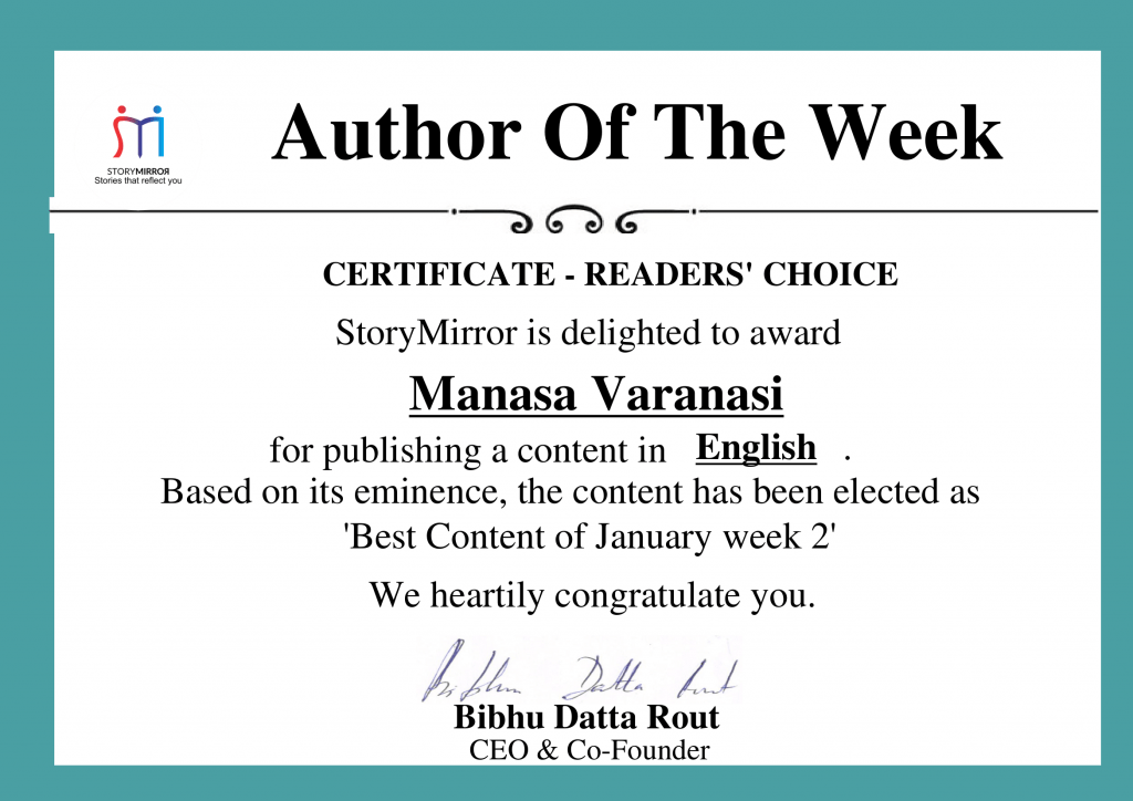 It still is a puzzling thought to me, why did my social education overpower my gut feelings? It had prompted me to kill the snake. As I took a twig from the damp soil and tried to strike it, the snake turned to me with its blue eyes like ink drops, looking at me with pity. As it suddenly vanished in quick swirls into the depths, it left me with the guilt, imagining myself to be so cruel!